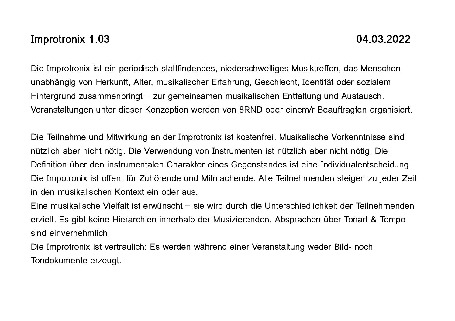 Wundervolle Zusammenkünfte musikalischer Art sind die „Improtronix“ betitelten Veranstaltungen die stets im Deckerschen Wohnzimmer stattfinden. Seit 2021 werden Musiker*Innen jedweder Coleur periodisch dazu eingeladen mit einem Instrument ihrer Wahl an einem sehr vergänglichen, und auch nicht aufgezeichnet oder verbreiteteten, musikalischen Stelldichein teilzunehmen. Die Wortneuschöpfung Improtronix bedient sich der Begrifflichkeiten Improvisation und Elektronik um den Schwerpunk und auch die Abgrenzung zur „Jamsession“ darzustellen. Das bespielte Genre ergibt sich stets aus der Zusammensetzung & Instrumentierung der Mitwirkenden: Wichtig ist stets die Experimentierfreude der anwesenden Kunstschaffenden. Der sehr private Charakter, der durch das Fehlen einer öffentlichen Rezeption und der Absenz von Aufnahmetechnik gestaltet wird, soll jenseitig von Social Media den musikalischen Kontakt und das Netzwerk von Kulturschaffenden stärken und die aufmerksamkeitsmediale Verwertung in den Hintergrund treten lassen.